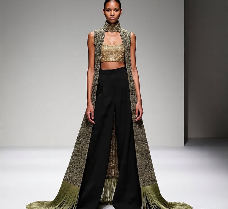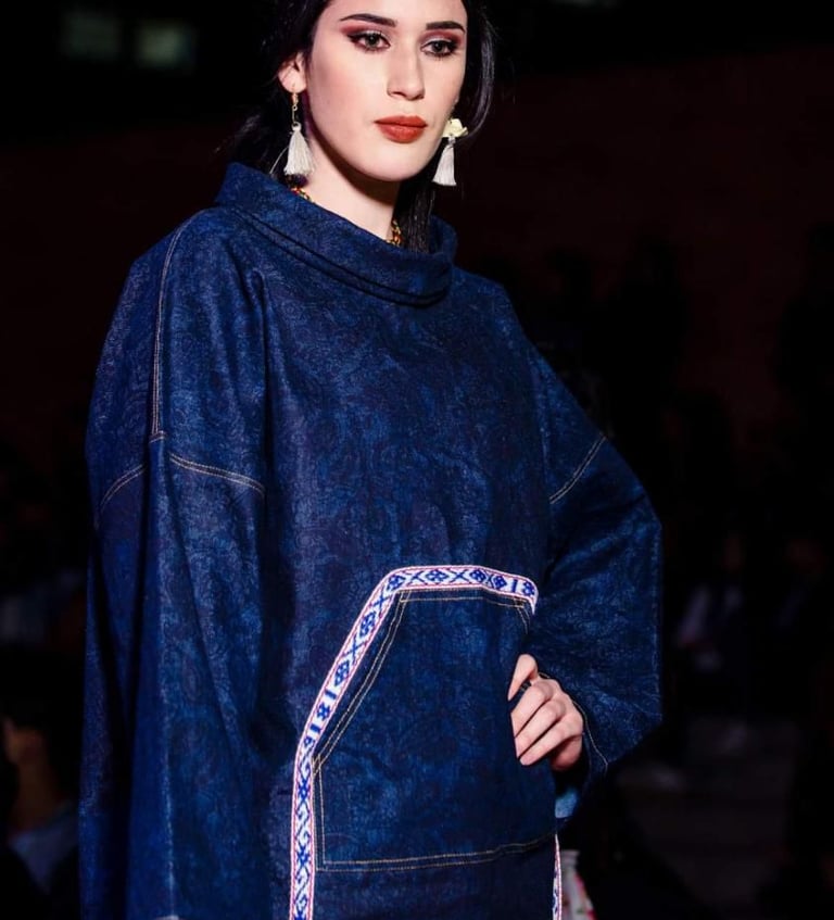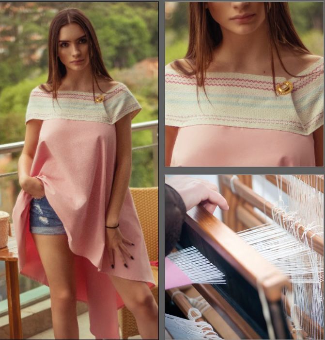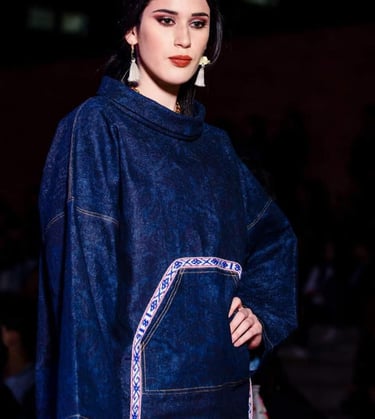 El denim se vuelve otro de nuestros protagonistas, gracias a las intervenciones con tejidos de la comunidad Kartmenza del sur de Colombia, tejedores indígenas.